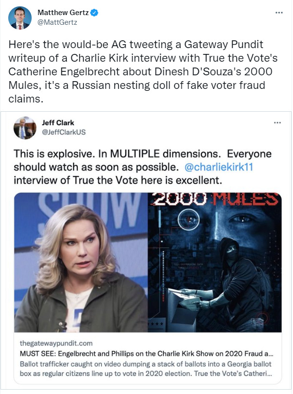 (1) The only man at the Department of Justice willing to carry out Trump’s schemes—environmental lawyer Jeffrey Clark—had his home searched on Wednesday by the feds. Law enforcement won’t confirm the reason for the raid, but it is almost certainly connected to his efforts to alter the election results.
