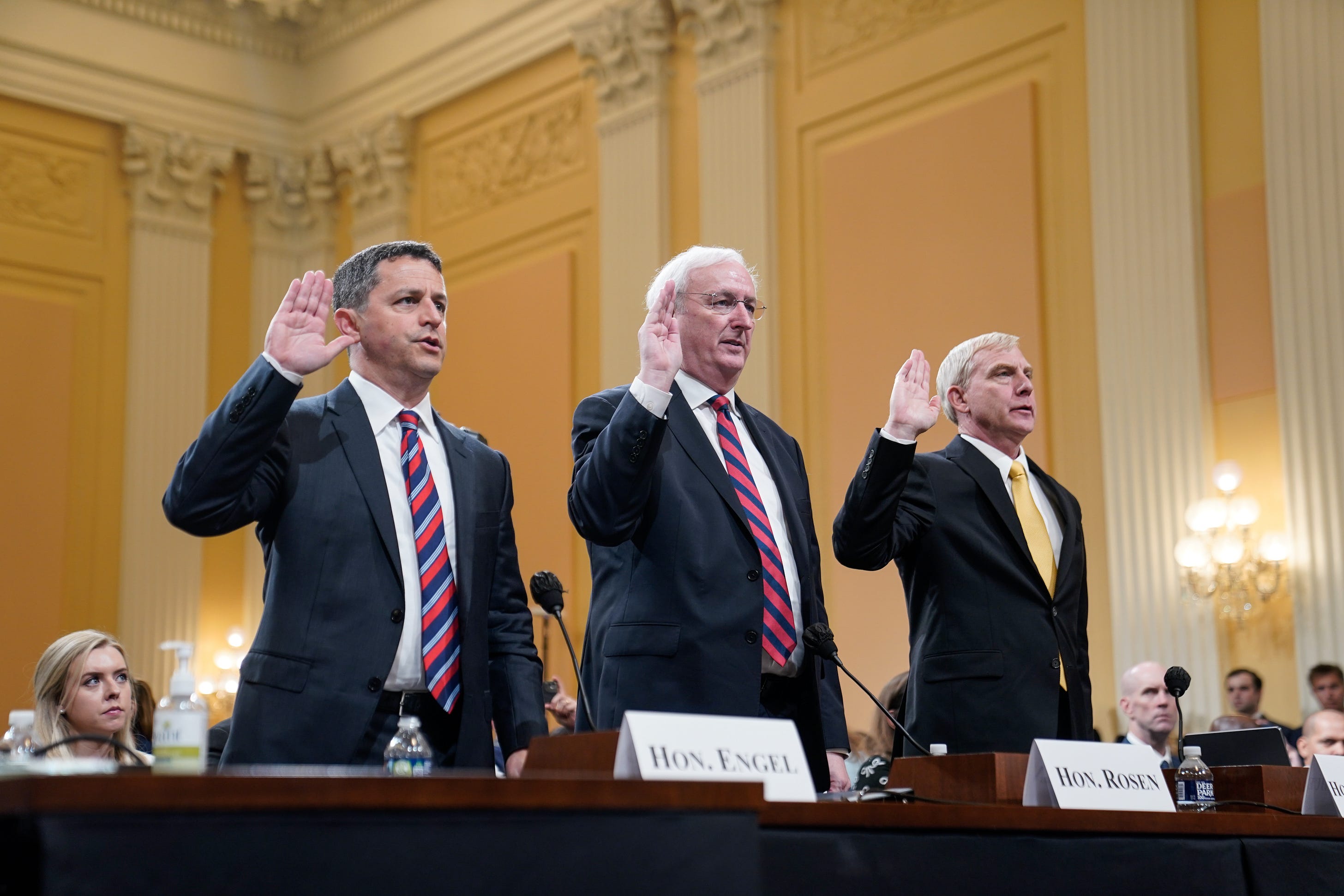 Left to right, witnesses Steven A. Engel, Jeffrey Rosen and Richard Donoghue are seen as the House Jan. 6 select committee holds a hearing on Capitol Hill on Thursday, June 23, 2022. (Demetrius Freeman/The Washington Post via Getty Images)