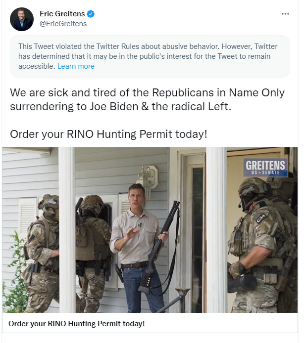 “Join the MAGA crew, get a RINO hunting permit. There’s no bagging limit, no tagging limit and it doesn’t expire until we save our country.”