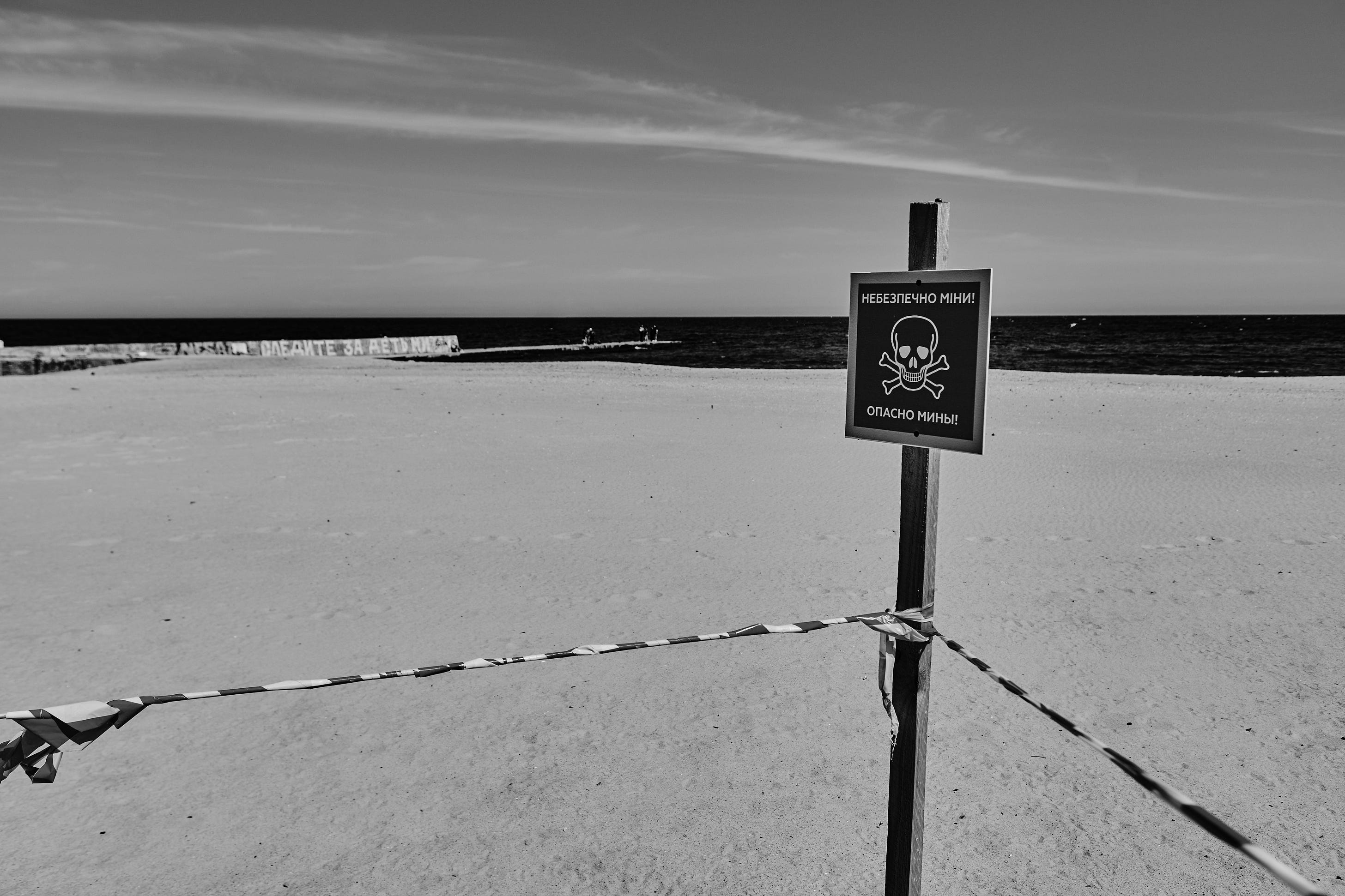 A sign that reads “Caution: mines” is taped a beach on May 27, 2022 in Odesa, Ukraine. (Photo by Yevhen Zinchenko/Global Images Ukraine via Getty Images)