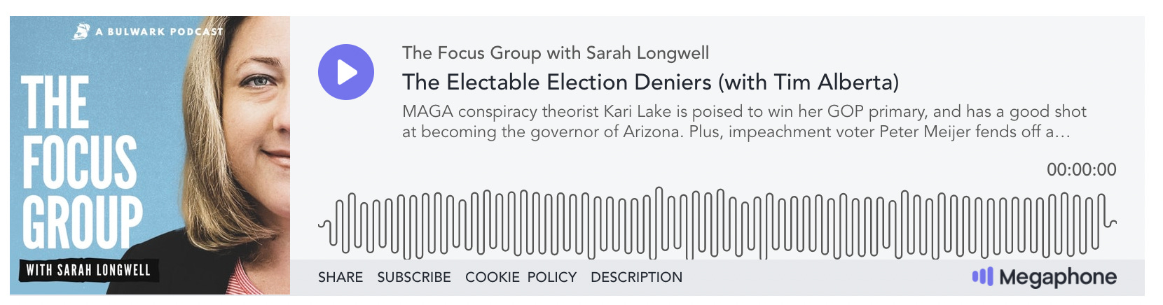 MAGA conspiracy theorist Kari Lake is poised to win her GOP primary, and has a good shot at becoming the governor of Arizona. Plus, impeachment voter Peter Meijer fends off a primary challenge, as a crazy cast of Michigan Republicans attempt to take down Gov. Gretchen Whitmer. The Atlantic’s — and Michigan’s own — Tim Alberta joins Sarah on this week’s episode. Biden’s getting a lot done, the Dems are finding their footing, and Joe Manchin is the face of the climate bill. Plus, the tactical perspectives of a third party, a preview of Tuesday’s primaries, and the gaudy and gross LIV. Will Saletan’s back with Amanda Carpenter for Summer Mondays. Bulwark+ members can listen to an ad-free version of these podcasts on the player of their choice. Learn more at Bulwark+ Podcast FAQ.RICH THAU AND JILL DITOMMASO: Republicans Explain Why They’re Cooling on Trump.Sarah Longwell, a master at detecting emerging trends from focus groups, has recently been alerting audiences that Republican voters are losing their enthusiasm for a third Trump presidential run. Curious to hear what declining GOP support for Trump actually sounds like—and to get a sense of what’s animating it—we took the opportunity on July 26 to probe that topic, and various others, in two focus groups. The respondents were not our usual Trump-to-Biden swing voters, but rather thirteen Missouri Republicans who, even at this late date, remain undecided in the state’s August 2 GOP Senate primary. (Disclosure: The research was sponsored by Arnold Ventures.) While these Republican respondents expressed mixed emotions, they were by and large either opposed to or underwhelmed by the possibility of a Trump 2024 presidential run. ADDISON DEL MASTRO: Housing, Homelessness, and the Elephant in the NIMBY Room.