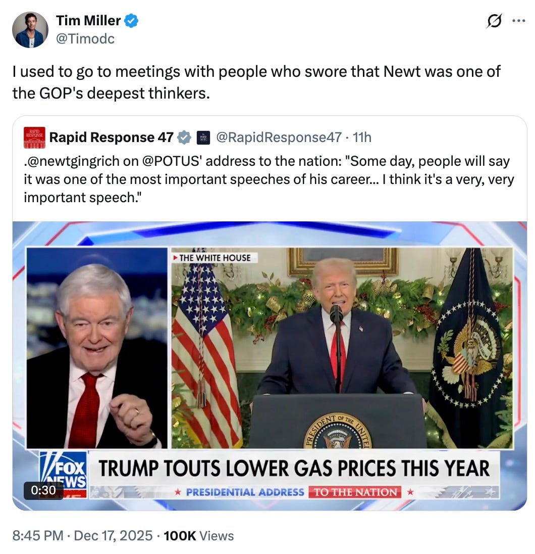 A Nothingburger (With Ketchup and Diet Coke)Let’s just say that Trump’s address Wednesday night was not the height of presidential oratory.Some rare good economic news this morning: The Bureau of Labor Statistics reported an annualized inflation rate last month of 2.7 percent, a slower rise in prices than the 3.1 percent rate economists had projected. The data-collection gap caused by the recent government shutdown makes it hard to put this number in context, and other indicators, like the jobs market, are still indicating a worrying economic slowdown—but perhaps we can hope that slowdown won’t continue to be accompanied by punishing inflation after all. Happy Thursday. Oh, and by the way, sign up for a Bulwark+ membership today and your first 30 days are free: Can We Get Those 18 Minutes Back?by William Kristol What to think of Donald Trump’s speech from the White House last night? I’m with Tim Miller: “I was embarrassed. It’s really unbelievably stupid that we’re here, that this person is the president, and that that was real—that was not a spoof.” I’d only add that it’s unbelievably stupid that we’re stuck with this person as president for three more years. And we’re stuck with apologists like Newt Gingrich, once a formidable figure. Last night, Newt made this unbelievably stupid statement: “Some day, people will say it was one of the most important speeches of his career . . . I think it’s a very, very important speech.” No, it wasn’t a very, very important speech. It wasn’t even a slightly important speech. It was a pointless speech. It was a waste of 18 minutes of prime time. But it also left me with a sense of relief. Only perhaps temporary relief, to be sure—but still, you take what you can get these days. Why? Because Trump didn’t use the network prime time he’d requested to announce we were going to war in Venezuela. After all his bellicose rhetoric, after all his bluster in press gaggles, Trump had a chance to make his case for war to the nation. He failed to take it. He didn’t even mention Venezuela. I suppose Trump could still launch an attack soon. He surely doesn’t think a president has some kind of obligation, if he’s going to use military force, to explain the rationale to the public—let alone to get authorization for it from the people’s representatives in Congress. Perhaps he’s just waiting until Congress is out of town next week, so there’s less chance of effective pushback. Still, the idea of a war with Venezuela is already unpopular. It’s hard to see why it’s going to get any more popular. Perhaps Trump will continue to bluff rather than fight. So maybe we’ll be spared an unauthorized and unjustified foreign war. Which would be good. There’s another reason for my sense of relief. Last night’s speech reveals Trump has no sense of how he might save his foundering presidency, or even much of an inclination to try to do so. Indeed, yesterday’s Republican meltdown in the House in the face of increased health insurance costs, a faltering economy, and the deadline for the release of the Epstein files tomorrow—all of these suggest a rough holiday season for the administration. Which is good. A weaker Trump administration is better for America. One more point. A normal president, speaking after this past week—in which two U.S. soldiers were killed in Syria, after the shooting of the students at Brown, after the terrible attack on Jews celebrating Hanukkah in Sydney, and after the horrible murder of Rob and Michele Reiner—would have said something about how we mourned these tragedies. He might have asked for prayers for victims and their families in this holiday season. Of course, this never even occurred to the pathological narcissistic we have as our president. Indeed, I doubt people thought he’d bother mentioning this at all: The soft bigotry of low expectations. In any case, Trump is an embarrassment. And he will be a failed president. The question is how much more damage he’ll be able to do to our polity, our society, and our country. His Glory Is He Has Such Friendsby Will Saletan Donald Trump’s central goal in his prime-time address on Wednesday night was to reconnect with his voters. Many of them have said he’s spending too much time on foreign affairs and not enough on domestic concerns, especially the cost of living. So it was odd to hear the president, in his remarks, reassure America that the country is doing well because his foreign buddies say so. “One year ago our country was dead. We were absolutely dead,” Trump said. But “now we’re the hottest country anywhere in the world. And that’s said by every single leader that I’ve spoken to over the last five months.” During those months, Trump has named many of the autocrats and VIPs he claims have said this to him: Vladimir Putin, Xi Jinping, “the king of Saudi Arabia,” “the emir of Qatar,” the prime minister of Hungary, and “every leader of NATO.” Trump is, of course, lying. Some foreign leaders, to flatter him and mitigate their risk of exorbitant tariffs, have probably told him he’s doing a great job. But it’s absurd to imagine that all the presidents and prime ministers of NATO countries have told him (as Trump has alleged more than once) that America was dead a year ago. To say such a thing wouldn’t just overtax their tolerance for self-abasing dishonesty, it would damage their post-Trump relations with the United States. So why does Trump keep boasting that they said it? Because he’s a pathological narcissist. And because he thinks it will impress Americans. Last month, Trump hosted a White House dinner to honor a man for whom he has expressed glowing affection. It wasn’t a Pennsylvania miner or a Michigan auto worker. It was Mohammed bin Salman, the crown prince of Saudi Arabia. In his remarks, Trump said the crown prince was the first to tell him, “One year ago, we thought your country 