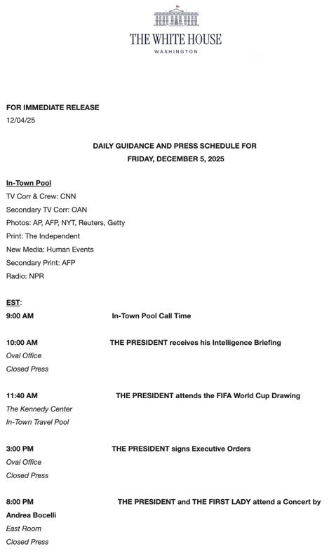 DAYBOOK, all Eastern Time unless otherwise notedDONALD TRUMPJD VANCENo known public events at this writing. CABINETHHS Secretary Robert F. Kennedy Jr.’s selected vaccine panel is gathering for a second day to assess revisions to newborn hepatitis B immunizations and to reexamine current childhood vaccine schedules. CONGRESS11:00am: The House meets for a pro forma session. INDIA-RUSSIA SUMMITRussian President Vladimir Putin and Indian Prime Minister Narendra Modi participate in the 23rd India–Russia summit in Delhi, India. BIDEN1:00pm: Former President Joe Biden delivers keynote remarks at a forum on LGBTQ rights, hosted by the LGBTQ+ Victory Institute. ECONOMY8:30am: September personal income, personal spending, and PCE index reports due out. ESSENTIAL READING/VIEWINGScoop: New fundraising platform ignites MAGA cash clash (Axios) “The Morning Meeting” topics:* Football is life. * Economy. * Health care. * Speaker Johnson. * Caribbean. * Ukraine-Russia. * Letitia James. * Redistricting. * Tucker, Candace, and Loomer, oh my. * Winners, losers, and what to look for this weekend. 2WAY TODAYYou’re currently a free subscriber to Wide World of News. |