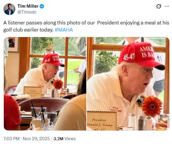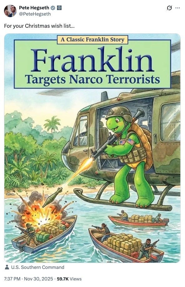 Don’t delay! We’ve extended our Black Friday sale for a few more hours. Upgrade today at 20% off for the next year and we’ll give away a Bulwark+ membership to someone who wants to join by can’t afford it. The only way through is together. You really just can’t take breaks around here, huh? While we were all busy digesting dinner Thanksgiving night, Donald Trump was tapping away at his phone doing a little supervillain brainstorming on Truth Social. The president promised to “permanently pause migration from all Third World Countries,” “remove anyone who is not a net asset to the United States or is incapable of loving our country, and “end all federal benefits and subsidies” to noncitizens living in America. On Friday, Trump went further, posting that “any document signed by Sleepy Joe Biden with the Autopen, which was approximately 92% of them, is hereby terminated.” Now this week we get to find out how much of this was tantamount to Michael Scott declaring bankruptcy and how much the president intends to actually pursue as policy. 2025! Happy Monday. Trump’s Gang of Criminalsby William Kristol “Remove justice, and what are kingdoms but gangs of criminals on a large scale?” Augustine made this suggestion 1,600 years ago, in The City of God. Today, in the country of Trump, we’re getting a convincing demonstration of Augustine’s proposition. Justice has been removed and a gang of criminals are in charge. They’re certainly acting on a large scale. Their expertise ranges from ordering war crimes to covering up sex crimes to engaging in all manner of financial criminality. They’re a diverse bunch, from tough guys outfitted in combat gear and masks rampaging through the streets of our cities, to smooth operators in tuxedoes who mingle with ease at state dinners. Their ranks encompass experienced criminals and newbies. They commit novel crimes and cover up old ones. Allies who had the misfortune to be caught—or were too bumbling to succeed—get pardons from the boss. It’s all a veritable festival of law-scorning; an amazing smorgasbord of law-breaking. And it turns out that if a president aggressively shuns any concern for justice and is willing to demonstrate utter contempt for the law—if he then disables the Department of Justice and the judge advocates general and almost all other internal checks and mechanisms of accountability—his gang can get away with a heck of a lot. They don’t even have to shoot particularly straight. And so we have an administration that embraces and pursues criminality greedily and shamelessly. They’re so far unpunished, and there doesn’t seem to be much expectation that they will be punished. Over Thanksgiving break, the Washington Post reported that Secretary of Defense Pete Hegseth ordered a second firing on a suspected drug-running boat near Venezuela to ensure that the survivors clinging to the wreckage were killed. Almost every serious person agrees with Andrew McCarthy of National Review and Fox News that, even without the second firing on the survivors, the three months of military strikes on the boats in the Caribbean are either “a war crime under federal law” or more likely simply “lawless.” But, McCarthy stresses, even “if we stipulate arguendo that the administration has a colorable claim that our forces are in an armed conflict with non-state actors . . . the laws of war do not permit the killing of combatants who have been rendered hors de combat (out of the fighting)—including by shipwreck.” In fact, every serious person knows that the second strike that reportedly took place to kill those two survivors of the original September 2 attack was illegal. Indeed, in its discussion of the duty to refuse illegal orders, the Department of Defense’s current law of war manual offers (in section 18.3.2.1) this instance of “Clearly Illegal Orders to Commit Law of War Violations:” “For example, orders to fire upon the shipwrecked would be clearly illegal.” Even President Trump gave a hint that he understood the problem when said last night that he would not have fired on the survivors. But he also said he didn’t know what happened and seemed pretty uninterested in finding out. And his secretary of defense hasn’t actually denied issuing that order. On Sunday evening, he put out a tweet with an AI-generated children’s book cover leaving the clear impression he’d do it again (see below). Based on what we’ve seen over the past year, there will be no internal investigation or consequences. McCarthy himself emphasizes that “this is a very serious matter”—but seems to accept that nothing is going to happen because even were efforts made, “President Trump is undoubtedly going to pardon any administration officials in potential legal jeopardy.” He’s probably correct. But are we simply stuck in this situation? Do we have no recourse? We have an utterly lawless administration both at home and abroad. Do we just have to live with it for at least three more years? And then hope the criminal gang permits free and fair elections? Yes, the courts can do some things. But they have to wait for cases to come to them, and ultimately they have a limited ability to force the administration to change course. There is one body in our system of government that could provide a recourse, that could make a difference: Congress. It may seem wishful to say—once again—that the rule of law depends on a Congress willing to assert its rightful authority and to hold the executive accountable. It may seem wishful to implore—once again—Republican members of Congress to put country and Constitution over party and political convenience. But could the wish finally be father to the thought? It was somewhat heartening to see the Republican chairmen of the Senate and House Armed Services Committees join the Democratic ranking members in expressing alarm at the reports of the killing of the survivors.