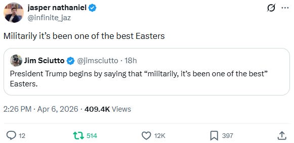 SAVE THE DATE… Southern California, we’re coming to you next month—May 20–21! Tickets will be on sale soon for Bulwark Live with TIM MILLER, SARAH LONGWELL, and SAM STEIN starting in San Diego and winding up in Los Angeles. Watch your inbox and keep an eye on TheBulwark.com/events. Quick HitsPAIN AT THE PUMP: Think gas prices are bad now? You haven’t seen anything yet. Financial analysts at JP Morgan are warning that if Iran’s blockade of the Strait of Hormuz continues for another couple weeks, it may lead to nationwide gas prices above $5 a gallon. Prices have already risen nearly a dollar a gallon over the past month, sitting today at a national average of $4.14. Trump has vacillated wildly in his public statements on the question of the strait, ping-ponging between shrugging statements that America doesn’t need it to reopen and ferocious demands that Iran reopen it immediately or face dire retribution. At his press conference yesterday, and in his post this morning, he threatened to destroy every bridge and power plant in Iran unless the Iranian government agrees by tonight to remove its choke on the strait. MORE THREATS AGAINST THE PRESS: Donald Trump has long believed that journalists who protect their government sources should face jail time. Yesterday, he issued his latest threat in this department—pledging to unmask “that leaker” who had tipped the press off about the rescue of an American pilot in Iran Friday, while efforts to find and rescue the second American shot down were still ongoing. “We’re going to go to the media company that released it,” Trump said during his long, rambling afternoon press conference, although many outlets reported on the rescue efforts. “And we’re going to say, ‘national security, give it up or go to jail.’ And we know who, and you know who we’re talking about.” The evidence of the American search-and-rescue effort was also available on social media, where Iranians were posting videos of specialized aircraft and sharp-eyed observers were able to determine quickly what was going on. DATA VIOLENCE: We’ve talked before about the growing populist backlash against AI in general and data center construction in particular, and yesterday we got a particularly alarming story in that vein out of Indianapolis. Last week, Councilman Ron Gibson voted in favor of a zoning measure he had championed to allow the construction of a data center in his district. The measure passed. Then, yesterday morning, someone shot up his home. Widely reported photos of the scene showed shattered glass and a front door riddled with holes; according to Gibson, thirteen shots were fired in all. And under his doormat, someone had placed a handwritten note: “NO DATA CENTERS.” The New York Times has more: